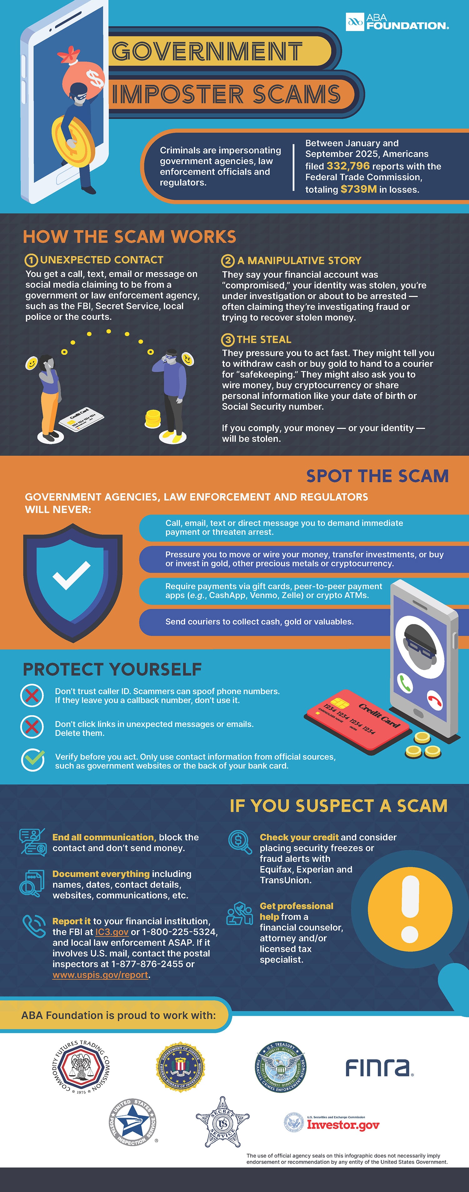 With the rise of AI and technology, various types of fraud have become increasingly sophisticated, including government imposter scams. Fraudsters attempt to impersonate government agencies using spoofing, faked credentials and manipulative tactics to put pressure on potential victims. According to the Federal Trade Commission, Americans filed 332,796 reports regarding government imposter scams between January and September 2025, totaling $739 million in losses, underscoring the magnitude of this threat.