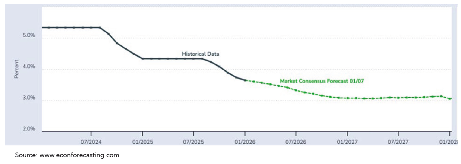 As has been well publicized, ongoing, broad drama between President Trump and the Federal Reserve, including Chairman Powell, has not completely subsided despite “The Fed” cutting interest rates by .25% in October and December (with some dissents) in addition to the .25% reduction in September. At least at this point, the Fed is not expected to reduce rates in January, although two .25% cuts are currently on the radar in 2026 as it forecasts 2.3% GDP growth, a 2.4% inflation rate and a 4.4% unemployment level.