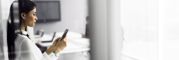 businesswoman looking at her smart phone in an office, display of Country Club Bank Business Mobile App