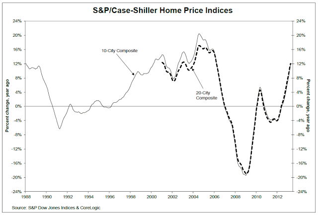 Is the big move up in rates finally here? I have been skeptical to this point, and quite frankly I am surprised at how the rates seem to refuse to bounce back. Unfortunately, much of the move has been Fed driven instead of by strong economic numbers. However, that may be changing, even if just marginally. The two big drivers to a true economic recovery will be housing and employment. First, let's look at housing, via the latest reading from the Case-Shiller index: