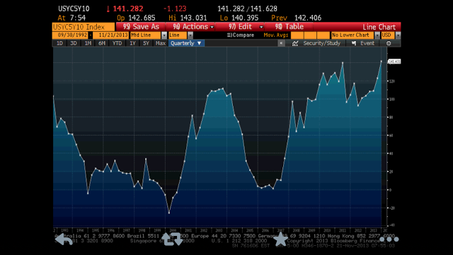 So, the market is being told that short term rates will stay low, but that long rates may soon drift higher as the Fed slowly reduces its presence as the market's overwhelming buyer.  There are plenty of opinions on both sides (for both higher and lower rates), but regardless of what you think will happen, the market is speaking rather loudly.  The curve is getting steeper, which we have seen through most of 2013.  The interesting thing, though (especially for the banking industry), is where the market is getting steeper.  Check out this chart from Bloomberg that shows the spread between the 5 year Treasury and the 10 year Treasury: