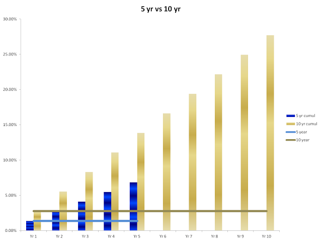 This morning, the 5 year Treasury had an annual yield of 1.37%.  The 10 year Treasury had an annual yield of 2.77%.  While the spread of 140 basis points does not seem that dramatic, let's compare an investment in the two instruments, summarized by this chart (note that for clarity this is oversimplified, ignoring the time value of money and reinvestments, both of which would make the difference even larger):