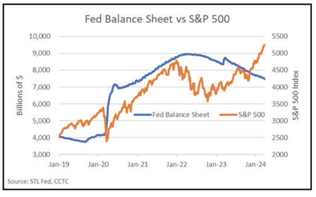 fed balance sheet imageAlthough the relationship between liquidity and equity markets is not perfect, growth in the Fed’s balance sheet does seem to be correlated with higher equity prices. Of course, other factors such as earnings, interest rates, etc. come into play. However, in the near-term, we would anticipate most market-pundits would agree with the rough relationship shown between the Fed’s balance sheet and the S&P 500. However, there is an important caveat to the story. Market liquidity can come from sources other than the Fed. Notice that the relationship between the size of the balance sheet and the S&P 500 breaks down during the fall of 2023. Given the continued drawdown in assets on the Fed’s balance sheet during Q4, 2023, we would have expected economic growth to soften and equity price appreciation a little harder to come by.