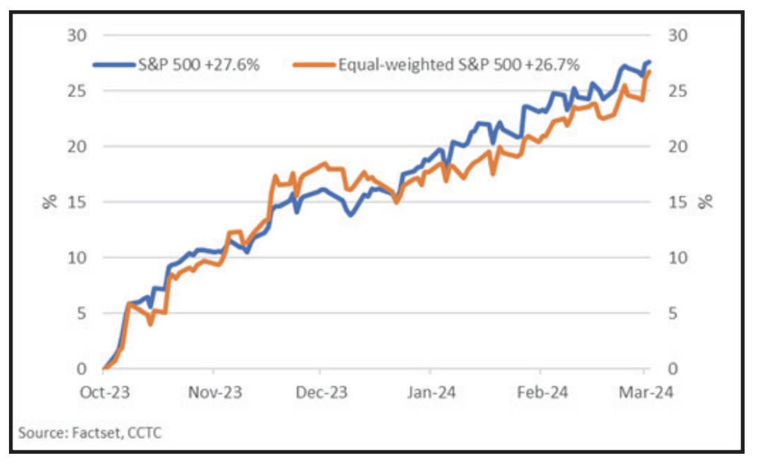 s&p 500 graph2024 got off to a strong start as the S&P 500 posted its fifth gain in six quarters, its second straight double-digit gain. While inflation news was somewhat mixed and the labor market continued to be tight, fourth quarter earnings results overall surprised to the upside and consumer confidence was a bright spot. During Q1, equity investors continued to prefer growth over value and megacaps over smaller stocks. This has been a theme over the past 18 months as large technology and communications services stocks have benefited from current and perceived earnings growth from artificial intelligence (AI). We view the improvement in breadth, or how the average stock is performing, since the near-term bottom in October of 2023 as positive. The average stock in the Equal-weighted S&P 500 has participated nicely versus the mega-cap names that dominate the capitalization-weighted S&P 500.
