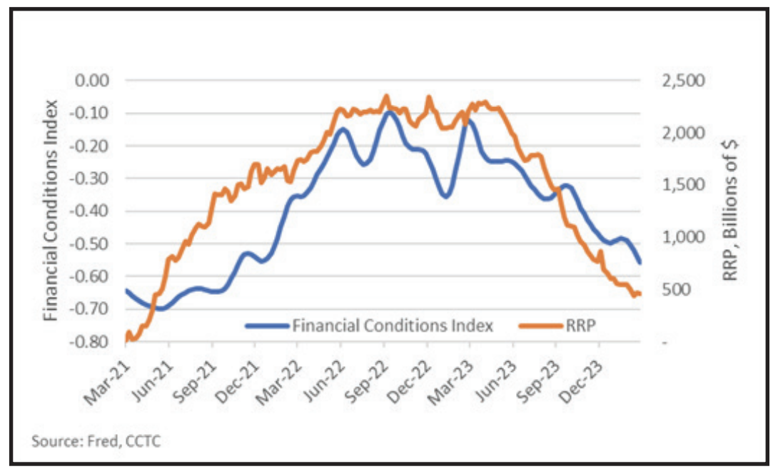 As we wrote about in the Q4, 2023 View From the Tower, liquidity flowing into the economy out of the reverse repo program (RRP) at the Fed has been overwhelming the withdrawal of liquidity from QT. Without getting into too many specifics, the RRP serves as a facility money-market funds can park cash overnight and earn interest similar to Fed Funds. Over the last 9-months or so, it has been advantageous for these funds to exit RRP’s and buy T-bills. It is astonishing that $1.8 trillion of liquidity has entered the system over the past year.