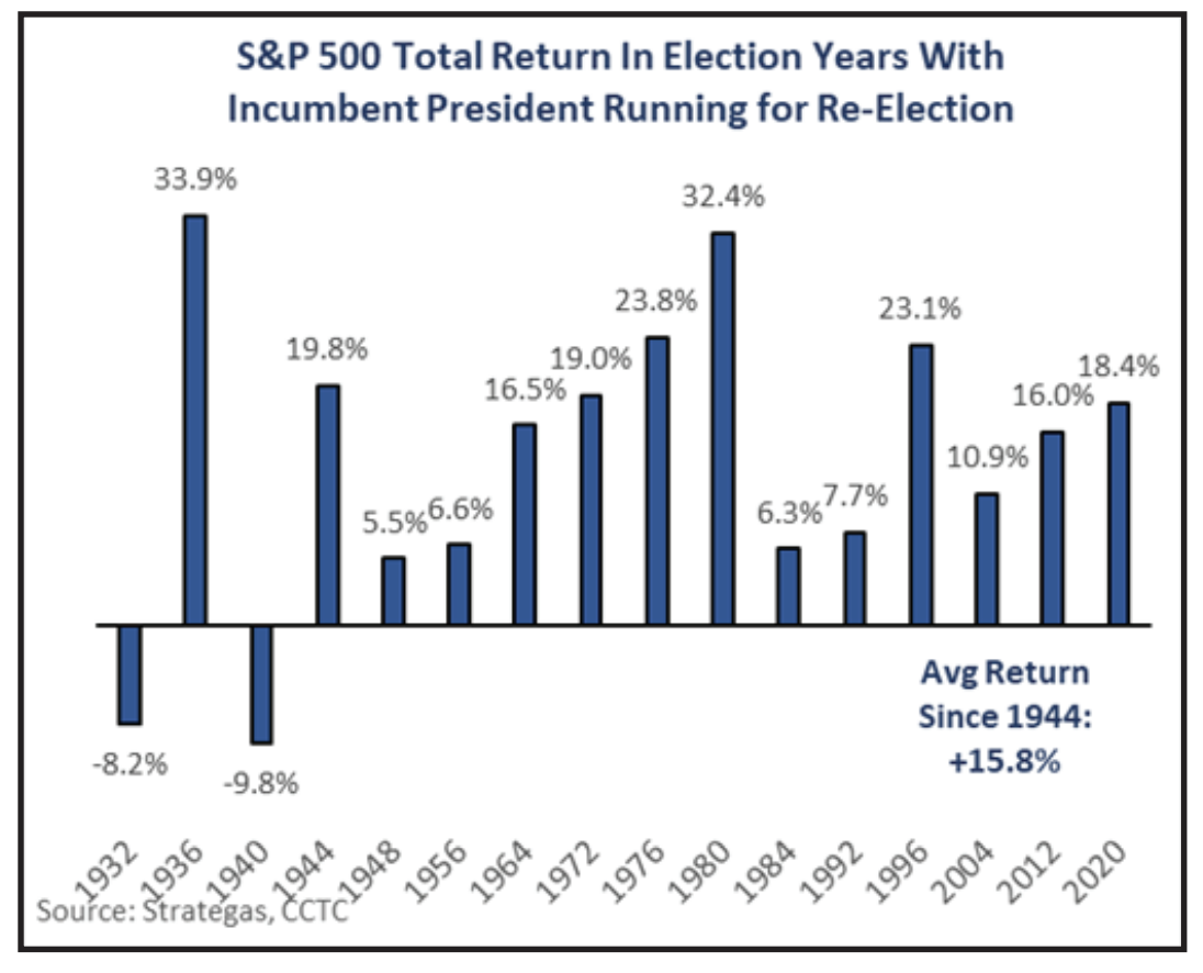 S&P 500 total return in election years graphWe could be entering a short window of tighter liquidity conditions. Not only will financial conditions be affected by the RRP, but also April tax collections may create a short-term liquidity and fiscal drag. As we all know, equity markets performed well in 2023. It’s time for investors to pay-up! The Treasury is expected to receive a windfall in capital gains tax revenue this year. Analysis shows Treasury sitting on $1 Trillion post-tax season, $270 billion greater than current levels. Pulling these dollars out of the economy, although briefly, should create some drag on the economy and possibly create market headwinds. However, Treasury could spend that down as we head toward November elections. Fiscal policy could provide some additional gusto as well. Spending associated with the Infrastructure Investment and jobs Act, passed in 2021, should also ramp-up into the elections. Incumbent Presidents do not like to lose when running for a second term and at this point the election seems like it could be historically tight. Greasing the wheels in an election year is commonplace. Equities typically enjoy the ride.