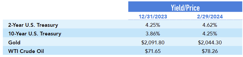 - Significant headlines for the month included relatively negative inflation news and Federal Reserve commentary that more work needs to be done on the inflation front, pouring cold water on the number and cadence of potential rate cuts in 2024.